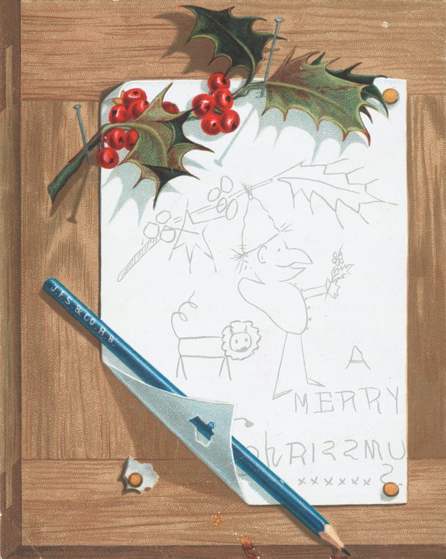 greetings · greeting · card · christmas · christmas card · celebrate · happy christmas · merry christmas · seasons greetings · noel · xmas · festive · sketch · drawing · pencil · pin board · drawing pins · holly · berries · a merry chrizzmus · Private Collection / Bridgeman Images · / Look and Learn |