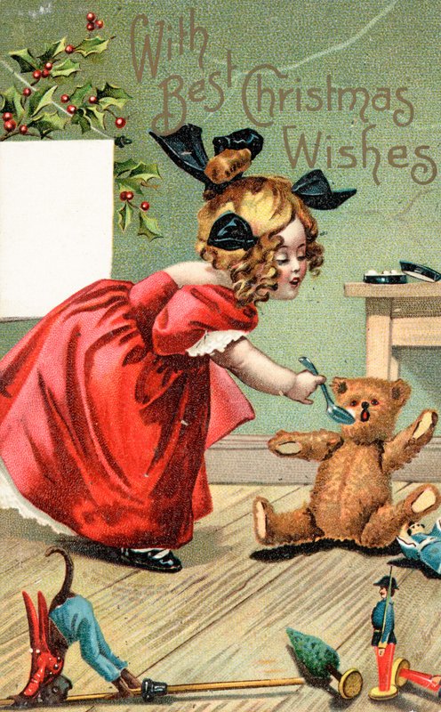 christmas · greeting · cards · children · girls · teddy · bears · toys · playing · british christmas · card · Private Collection / Bridgeman Images · / Look and Learn |