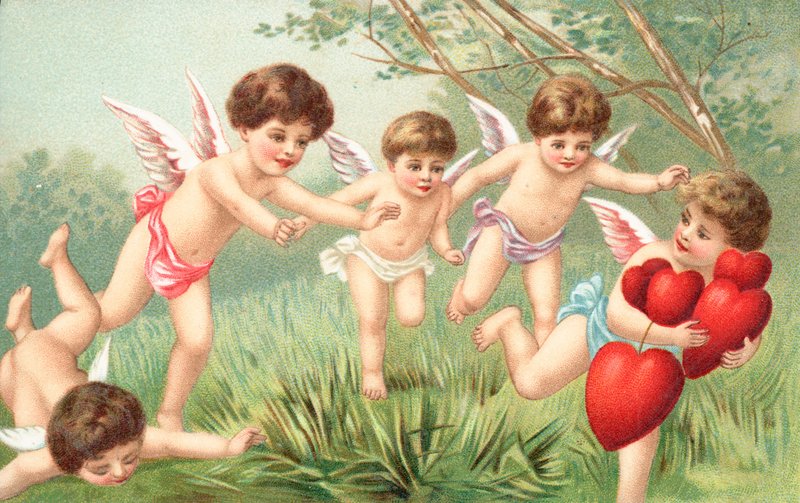 postcards · greeting · century · valentines day · cards · valentine · cherubs · running · chasing · hearts · british valentine · card · Private Collection / Bridgeman Images · / Look and Learn |