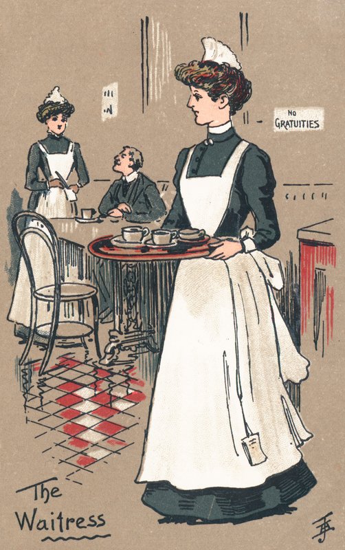 postcards · century · waitresses · cafes · interiors · uniforms · furniture · tables · chairs · people · women · employment · The Waitress · Private Collection / Bridgeman Images · / Look and Learn |