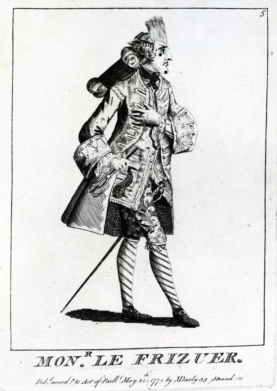 satire · satirical · fashion · dress · costume · fashionable · french · european · hairdresser · coat · sword · flamboyant · barber · trade · proffessional · profession · Private Collection / Bridgeman Images
