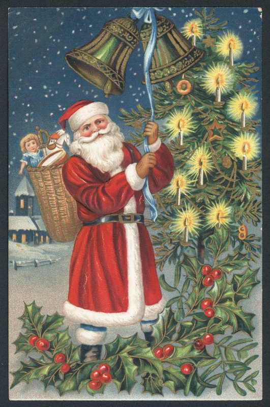 greetings card · christmas · christmas card · father christmas · santa claus · basket · christmas presents · presents · gifts · toys · candles · bells · holly · snow · snowing · Private Collection / Bridgeman Images · / Look and Learn |