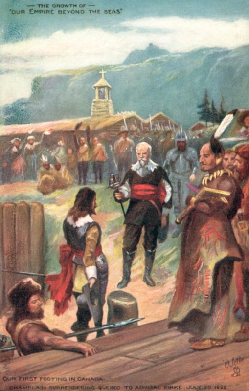 seas · cards · sword · swords · card · sons · our first footing · church · quebec · colony · empire · historical · surrender · spear · 20 july · colonialism · postcard · canada · colonial · postcards · surrendering · admiral kirke · history · samuel de champlain · raphael tuck · Private Collection / Bridgeman Images · / Look and Learn