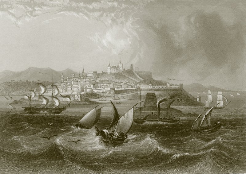 tangier · gibraltar · waves · ships · coast · town · mediterranean sea · waves · sailing · Private Collection / Bridgeman Images · / Look and Learn |