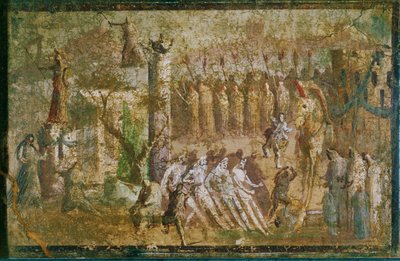 animal · army · horse · fresco · painting · italy · europe · wall · landscape · pompei · soldier · trojan war · antiquity · ancient greece · mythology · iliad · homer (8th century bc) · poet · fortification · · Museo Archeologico Nazionale, Naples, Campania, Italy / Bridgeman Images