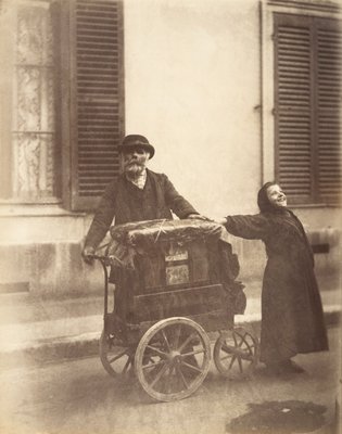 male · organ player · street scene · musical instrument · playing · elderly · beard · bearded · female · child · smiling · happy · happiness · outstretched arm · smiling · smile · singing · road · c19th · black and white photograph · b w photo · france · paris · french · parisian · shutters · exterior · architecture · window · Corcoran Collection, National Gallery of Art, Washington D.C., USA / Bridgeman Images