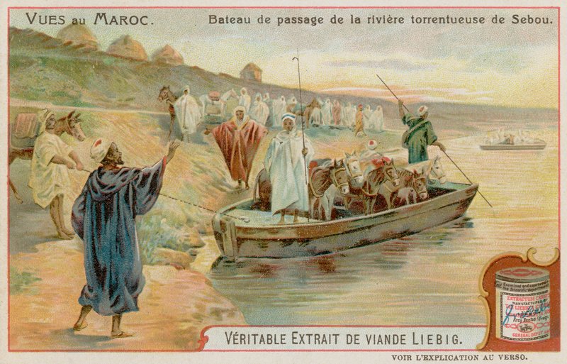 views of morocco · everyday · life · arabic · landscapes · scenes · ferry boats · sebou river · donkeys · crossing · pole · boats · Private Collection / Bridgeman Images · / Look and Learn |