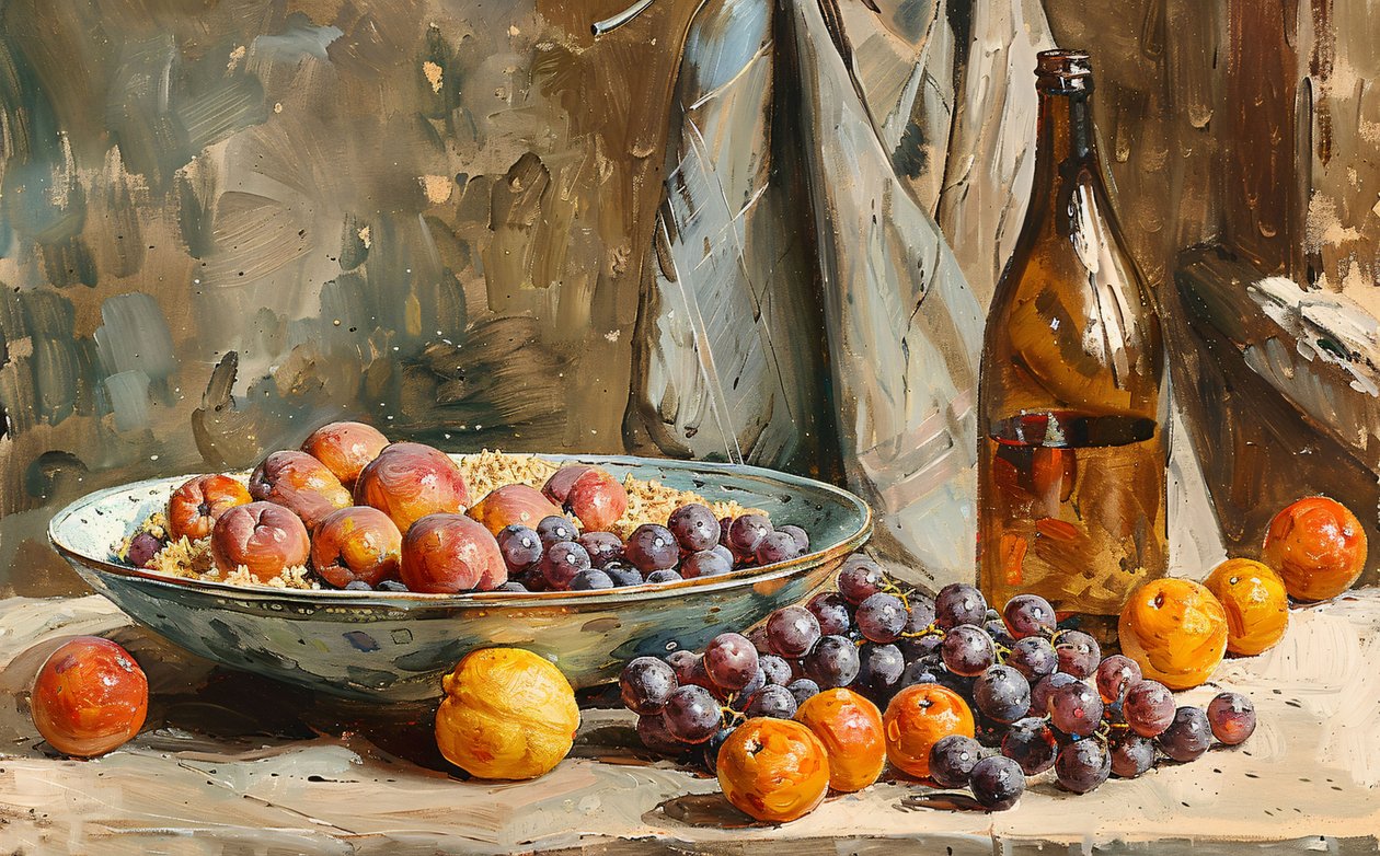 A still life, fruits & bottle of wine by F. Abderrahim. Available as an art print on canvas, photo paper, watercolor board, uncoated paper or Japanese paper.