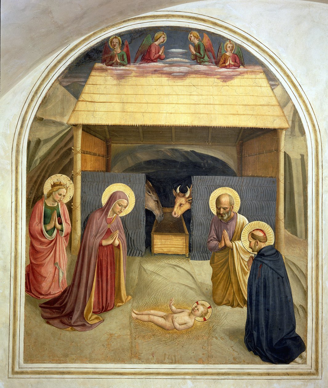 stable · oxen · holy family · saints · angels · christ · child · adoration · worshipping · praying · kneeling · cell 5 · renaissance · saint · saints · nativity · birth · infant · jesus christ · virgin mary · madonna · religion · christianity · new testament · Museo di San Marco dell'Angelico, Florence, Italy / Bridgeman Images |