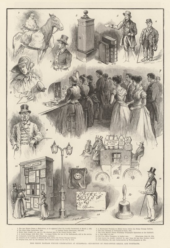 penny postage jubilee celebration · guildhall · exhibition · post office relics · portraits · robert paton · driver · manchester postman · official · livery · penny postage reform · pillar letter · london postal directories · 1840-1890 · postman · newcastle on tyne · heber dale · shortest · postal service · lord mayor · guests · watching · telegraphic operations · woman · bell · james nobbs · mail · guards · post office · lamp · post · fire · alarm · old post office timepiece · leather · case · analysis · london · edinburgh mail · arabic · general gordon · khartoum · 22 june 1884 · bellmen · john brindley · letter · carrier · Wolverhampton · 1834 · Communications · Postal · Exhibitions · City of London · Private Collection / Bridgeman Images · / Look and Learn |