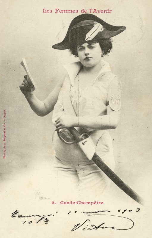 women of the future · humour · female · profession · garde champetre · uniform · amusing · sexual · european · woman of the future · clothes · french · humorous · jobs · guard · warden · role · postcard · uniforms · roles · dressing · stereotypes · funny · entry · postcards · dress · freedom · opportunity · professions · liberation · bergeret · les femmes de lavenir · womens emancipation · france · Private Collection / Bridgeman Images · / Look and Learn |