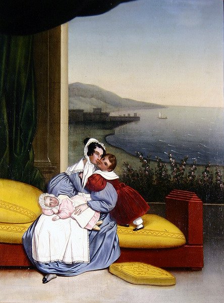 coast · coastline · shoreline · maritime · window · female · child · motherhood · view · baby · seated · beach · daughter · seaside · shore · mother · painting · Mzpainting · Private Collection / Bridgeman Images |