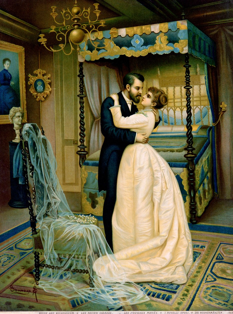 les nouveaux maries · newly weds · end of nineteenth century · los recien casados · embrace · wedding wreath · four poster bed · four-poster · groom · couple · lovers · love · romantic · romance · wedding night · baldaquin · Private Collection / Bridgeman Images