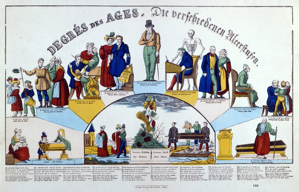 youth · middle age · elderly · pinnacle is 50 years · cradle to grave · stages of life · childhood · life cycle · death · ageing · french-german · lorraine · coffin · alterstuffen · vie · Private Collection / Bridgeman Images |