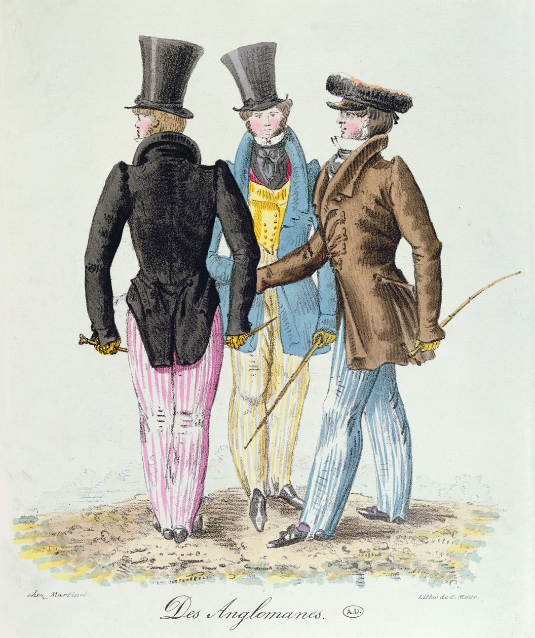 male · three · young · full length · dandy · dandies · top hat · suit · stick · fashion · fashionable · style · stylish · anglomania · elegant · Musee de la Ville de Paris, Musee Carnavalet, Paris, France / Bridgeman Images