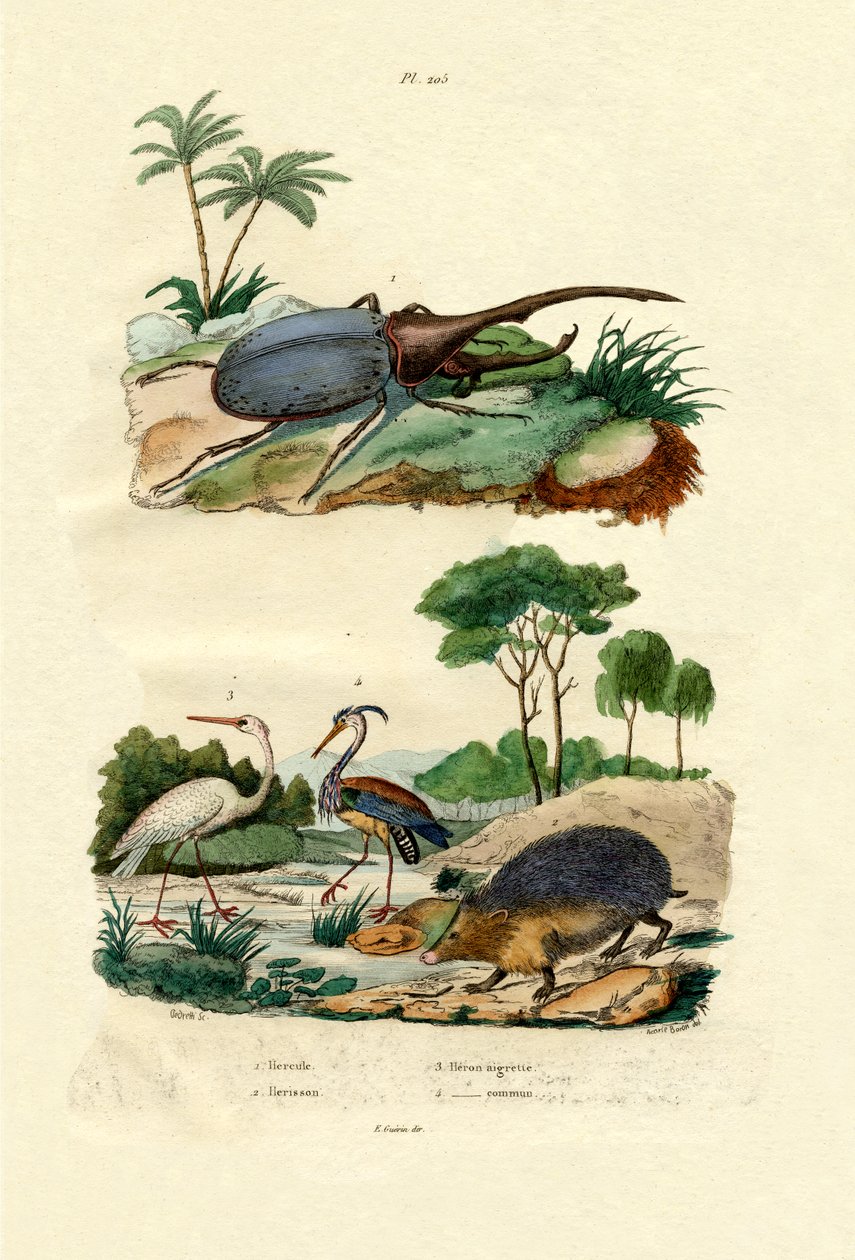 birds · animals · grey heron · beetles · hercules beetle · heron · egret · great egret · hedgehog · insects · mammals · illustration · Private Collection / Bridgeman Images