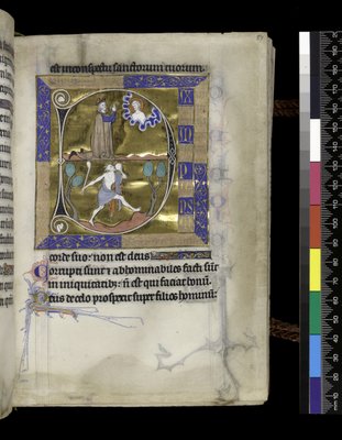royal · manuscript · prayer book · book of hours · psalter · isabelle · isabelle de france · isabella of france · medieval · gothic · illuminated · religious · ecclesiastical · faith · spirituality · christian · christianity · initial · david · king · king david · prayer · praying · fool · club · disc · folly · landscape · dancing · blue · gold · gilt · gilded · Fitzwilliam Museum, University of Cambridge, UK / Bridgeman Images