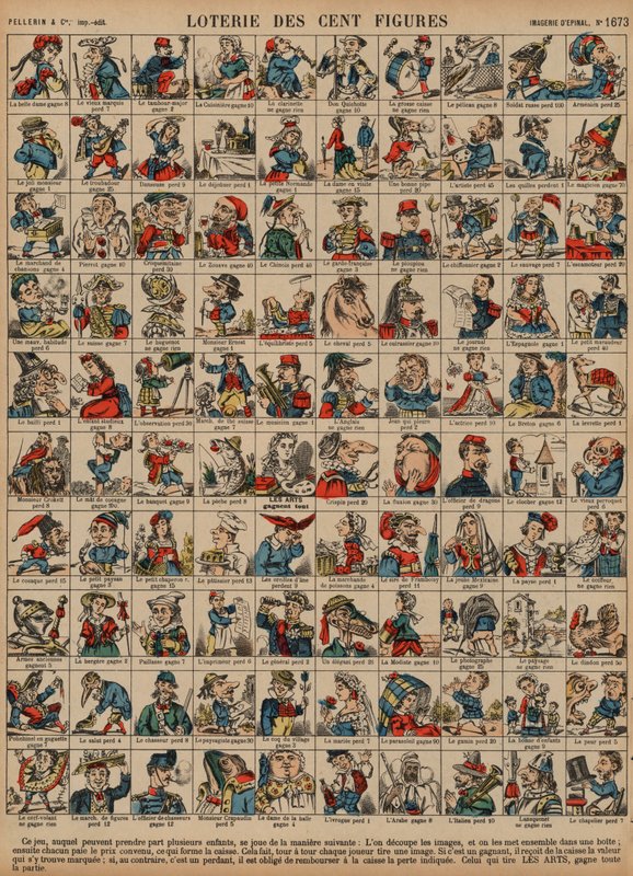 Alphabetical lottery of a hundred images Alphabetical Lottery of the Cries of Paris Alphabetical lottery of animals Lottery of a hundred subjects Alphabetical Lottery of a Hundred Caricatures Story of Austrian Soldier Sergeant Fritz Kreutzer Franco-Russian Lottery Game Images of Epinal de la Maison Pellerin - ca. 1913 - Illustration of Charles Perrault A Hot-Tempered Boy Called Georges Hunting Adventure of Tourlou, Berlou and Tourlouberlou The Gold Coin The pair of slippers Captain Goodman The story of Robert, the child of the troop Story of an American uncle and his cat The Robbers Robbed The adventures of Sergeant-Major Malgouzou The Interesting Adventures of Monsieur Pique-Assiette The Judgement of a Madman False and True Riches Puss in Boots William Tell The Adventures of Captain Bonenfant Caricatures of military figures Story of a Poor Donkey The Boy Soldier The Sailor Boy The different stages of a 19th century fire. Picture of Epinal from the 19th century Comic Military Alphabet