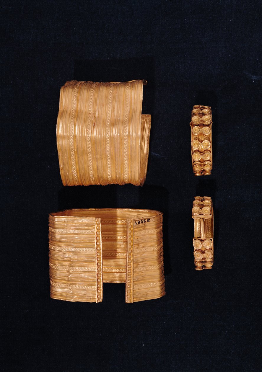 Two open facetted bracelets and a pair of earrings, from the princely tomb of Sainte-Colombe, Cote d'Or(Two open facetted bracelets and a pair of earrings, from the princely tomb of Sainte-Colombe, Cote d'Or (gold) (see also 128303 und 161006))Gaulish |