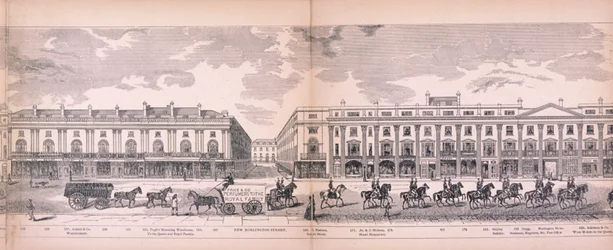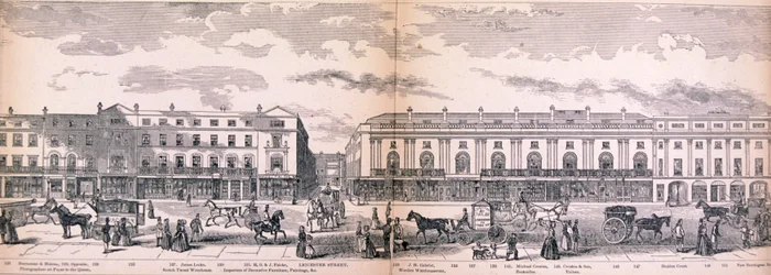 transport · transportation · animal · road · london · england · animals · horses · horse · street · industry · lane · avenue · advertising · westminster · location · century · monochrome · road transport · regent street · omnibus · 19th century · black white · black and white · nineteenth century · city of westminster · guildhall library art gallery · horse-drawn vehicle · leicester street · media industry · street life · wood engraving · panorama · george c leighton · r sandeman · sandeman · leighton · george c · London Metropolitan Archives (City of London)/Heritage Images