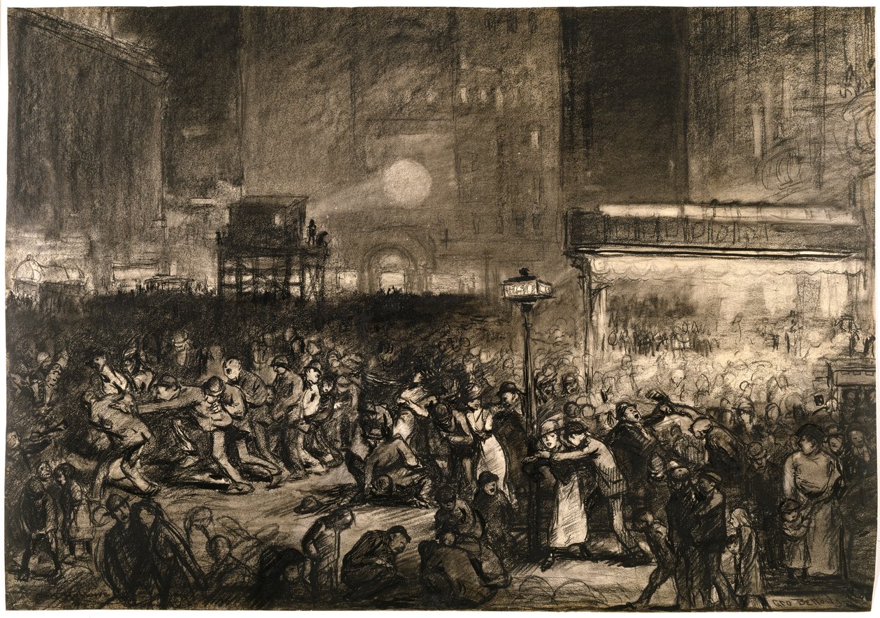 1900s · 20th century · a lot of people · fight · disorder · drawing · election · north america · america (continent) · crowd · lantern · lighting · night · politics · lamppost · cityscape · external view (building) · new york (city) · new york (state) · black and white · american realism · art movement · outside · city · mzdrawing · bellows george (1882-1925) · painter · artist · ashcan school · campaign · · / Bridgeman Images