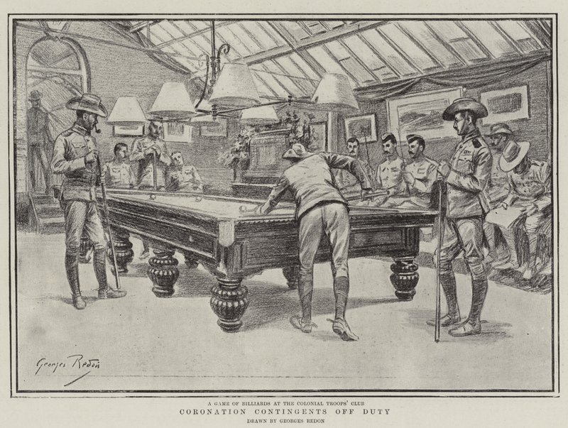 coronation contingents · off duty · game of billiards · colonial troops club · restoration · london · coronations · Private Collection / Bridgeman Images · / Look and Learn |