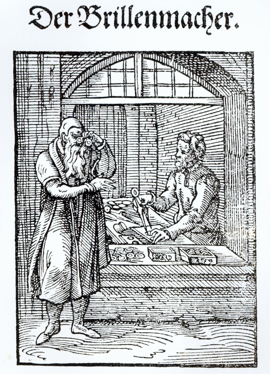 spectacles · customer · buying · selling · measuring · pair of compasses · shop · trade · business · der brillenmacher · optician · lens · making · Private Collection / Bridgeman Images |