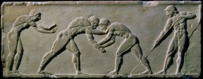 Greek Art: Base of Kouros Representing Wrestlers During a Fight(Greek art: base of kouros representing wrestlers during a fight. Marble relief stockings, 510-500 BC - Athenes, archeological museum - Fighting wrestlers - Marble bas relief carving of a kouros sculpture, 510-500 BC - National Archeological museum, Athens )Greek |