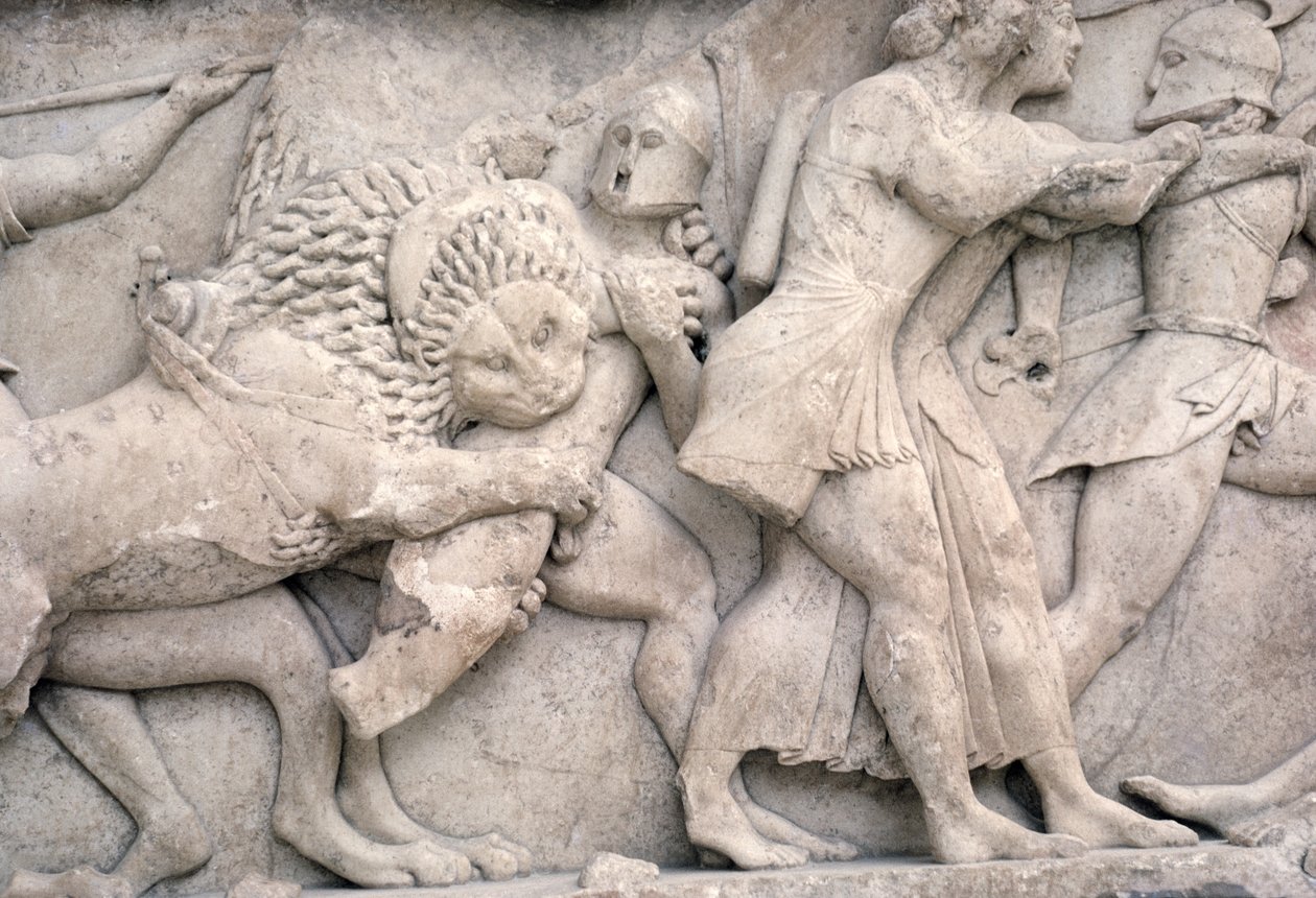 treasury of the siphnians · fight · syphnian · siphnos · syphnos · syphnians · sifnos · trojan war · trojans · greeks · greek · lion · soldiers · biting · combat · helmets · helmet · relief · Archaeological Museum, Delphi, Greece / Bridgeman Images |