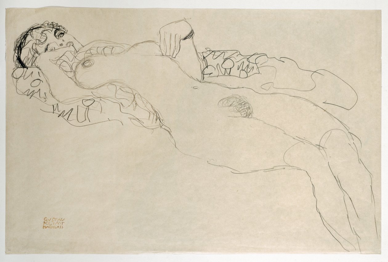 1910s · 20th century · art nouveau · art movement · drawing · woman · nudity · sexuality · black and white · reclining · klimt gustav (1862-1918) · austria · europe · painter · artist · · / Bridgeman Images |