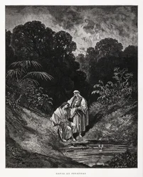 19th century · bible · bible (character) · bible (scene) · christianity · religion · engraving · doré gustave (1832-1883) · france · europe · painter · artist · black and white · mzengraving · figure · kingdom · vulgate bible · heroic · vertical · books of samuel · outdoors · friendship · gustave dore · israel · traditional culture · two people · covenant · engraving · religious illustration · only men · history · religion · dore bible · jonathan · la grande bible de tours · david · / Bridgeman Images