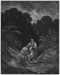 (David and Jonathan, heroic figures of the Kingdom of Israel, who formed a covenant of friendship recorded in the books of Samuel, Illustration from the Dore Bible)
