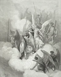 confrontation · rebel · fallen angel · sword · war in heaven · wing · cloud · devil · Private Collection / Bridgeman Images