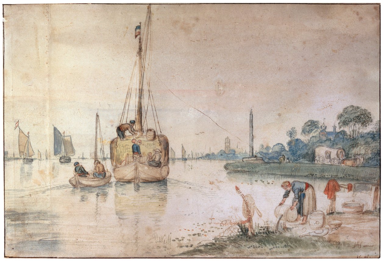 transport · transportation · river · water · female · women · woman · people · sailing boat · boat · boats · arts · painting · country · geography · holland · dutch · color · colour · cargo · location · sailboat · century · barge · drawing · lady · riverbank · transporting · 17th century · water transport · seventeenth century · geographical feature · sailing barge · watercolour · hendrick avercamp · avercamp · hendrick · dutch golden age · Fine Art Images/Heritage Images