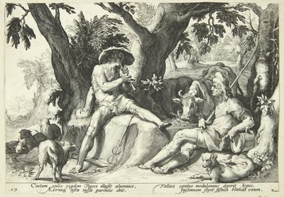Mercury Playing Flute for Argus from Ovid's Metamorphoses(Mercurius speelt fluit voor Argus Ovidius' Metamorfosen (series title))Hendrick Goltzius (workshop of)(print maker),Hendrick Goltzius(after design by),Franco Estius |