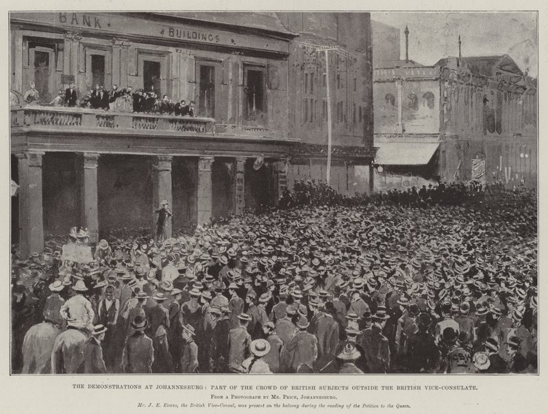 demonstrations · johannesburg · crowd · british subjects · british vice consulate · mr j e evans · petition · queen · south africa · crowds · street scenes · Private Collection / Bridgeman Images · / Look and Learn |