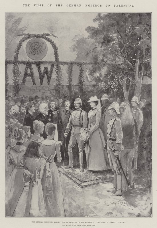 visit · german emperor · palestine · german colonists · presenting · address · his majesty · german consulate · haifa · wilhelm ii of germany · royalty · royal visits · israel · Private Collection / Bridgeman Images · / Look and Learn |