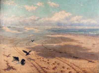 outdoors · ocean · england · beach · track · painting · bird · birds · view · geography · color · colour · northumberland · horizon · century · tyre track · crow · 19th century · elevated view · nineteenth century · geographical feature · oil on canvas · landscape · arial view · national museum cardiff · kay kays · newton sands · embleton · herbert charles sheppard · sheppard · herbert charles · National Museum of Wales/Heritage-Images