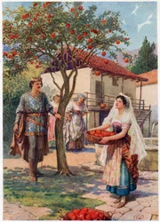 A Group of Two Men and Two Women, All in Costume, While Dancing Queen Philippa Pleading for the Citizens of Calais, illustration from Rosalind, Celia and Touchstone in "As You Like It" from Cecil Rhodes with the Matabeles from Three Well-Dressed Men and a Well-Dressed Woman Then Orpheus took his harp and began his magic song, illustration for Crusoe and Man Friday, illustration for Unloading the Mortella and her seven brothers, from King John Signing the Magna Carta, Illustration from General Maude Entering Baghdad, The Metropolis of the East, March 11th Water nymphs calling to the