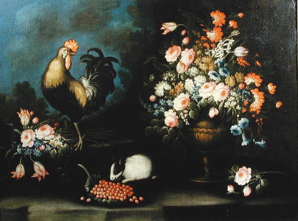 rose · roses · botany · botanical · natural history · science · flower · flowers · floral · flowers · rabbit eating · raspberries · cockerel · vase · painting · mzpainting · Trustees of Leeds Castle Foundation, Maidstone, Kent, UK / Bridgeman Images |