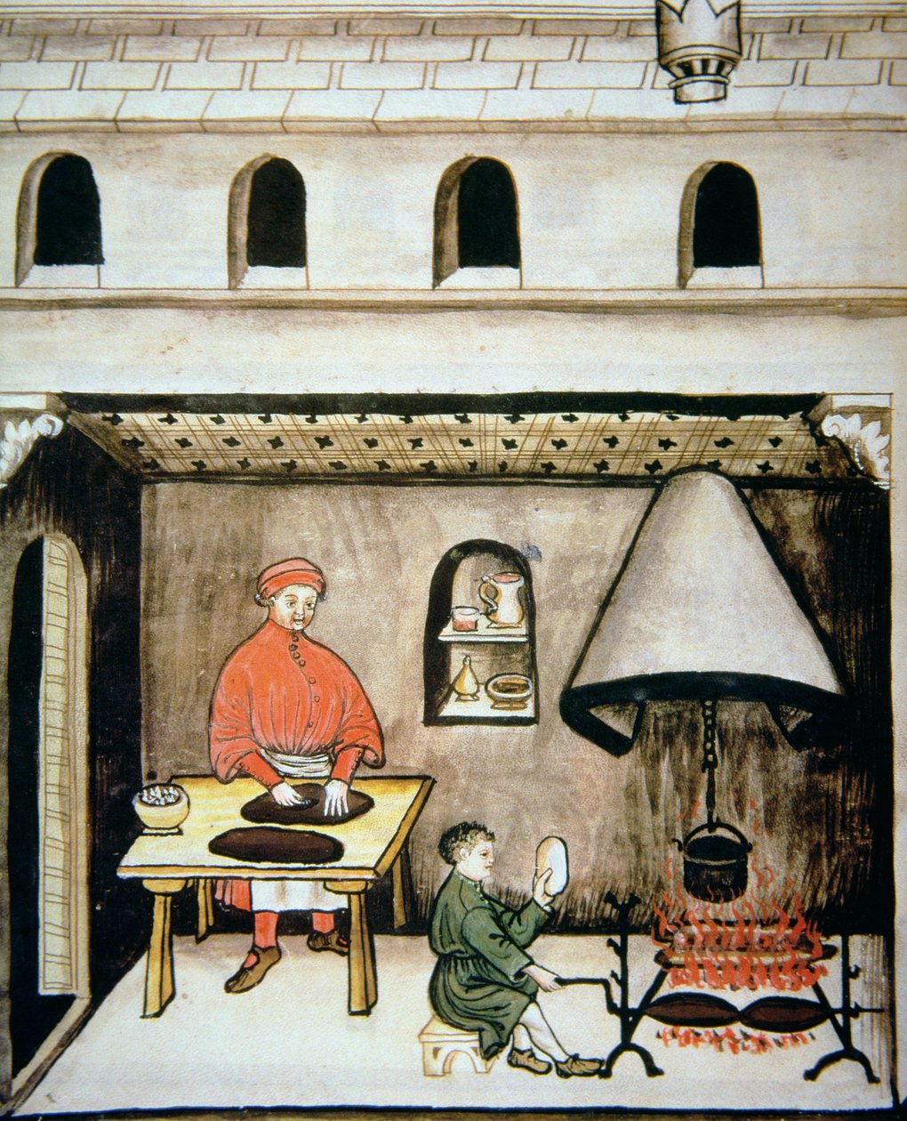 manuscript · interior · kitchen · preparing · fire · baking · cooking · domestic · spit · medieval · Osterreichische Nationalbibliothek, Vienna, Austria / Bridgeman Images |