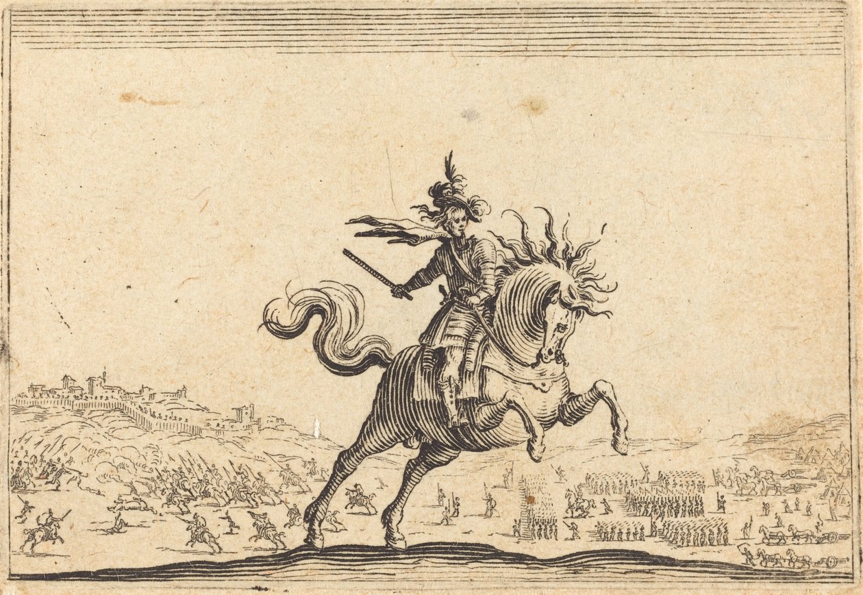 animal · people · male · animals · horses · horse · riding · rider · arts · country · french · france · baroque · military · location · armed forces · century · soldiers · soldier · horseback · concept · army · warfare · 17th century · commander · battlefield · black white · black and white · seventeenth century · etching · jacques callot · iacopo callott · baroque era · callot · jacques · callote · jacques · callotti · jacques · heritage art · print · Heritage Art/Heritage Images