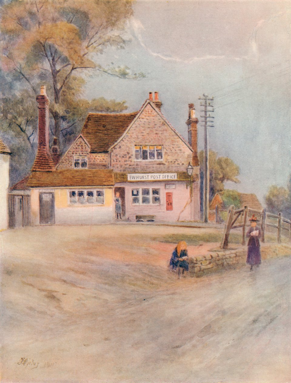 outdoors · road · building · buildings · england · female · people · male · communications · landscape · street · country · english · color · colour · lane · county · cottage · chimney · avenue · village · rustic · telecommunications · location · century · concept · telegraph pole · telegraph · surrey · telecommunication · watercolour · post office · postal service · chimneypot · 1910s · 20th century · rural · rural life · telegraph wires · watercolour · james s ogilvy · ogilvy · james s · george routledge sons limited · ewhurst · The Print Collector/Heritage Images |