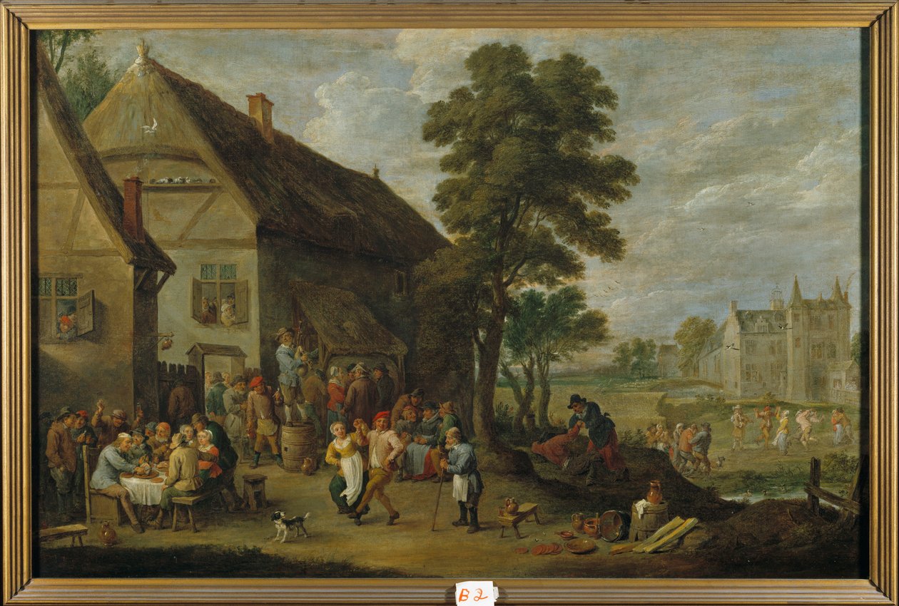 female · dancing · tavern · tree · dance · town · male · village · dutch · building · Private Collection / Bridgeman Images