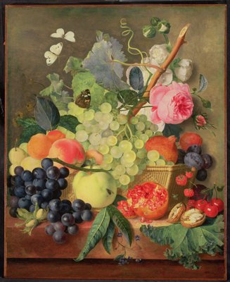 grapes · pomegranate · walnut · hazelnut · cherries · peach · plum · raspberries · butterfly · roses · Noortman, Maastricht, Netherlands / Bridgeman Images