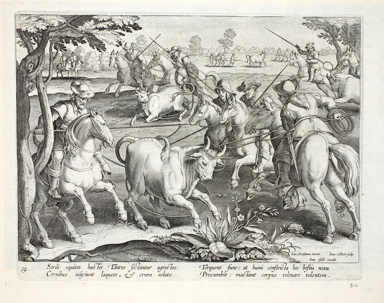 Sardinian Horsemen Capture Bulls with Ropes, Illustration from 'Venationes, Ferarum, Avium, Piscium', Engraved by Jan Collaert, Published by Phillipus Gal(Sardinian horsemen capture bulls with ropes, illustration from 'Venationes, Ferarum, Avium, Piscium' (Of Hunting: Wild Beasts, Birds, Fish), engraved by Jan Collaert (1566-1628), pub. by Phillipus Gal)Jan van der Straet |