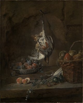 Dead Partridge Hung by One Leg, Bowl with Prunes and a Basket with Pears(Dead partridge hung by one leg, bowl with prunes and a basket with pears (painting on canvas))Jean-Baptiste Simeon Chardin |