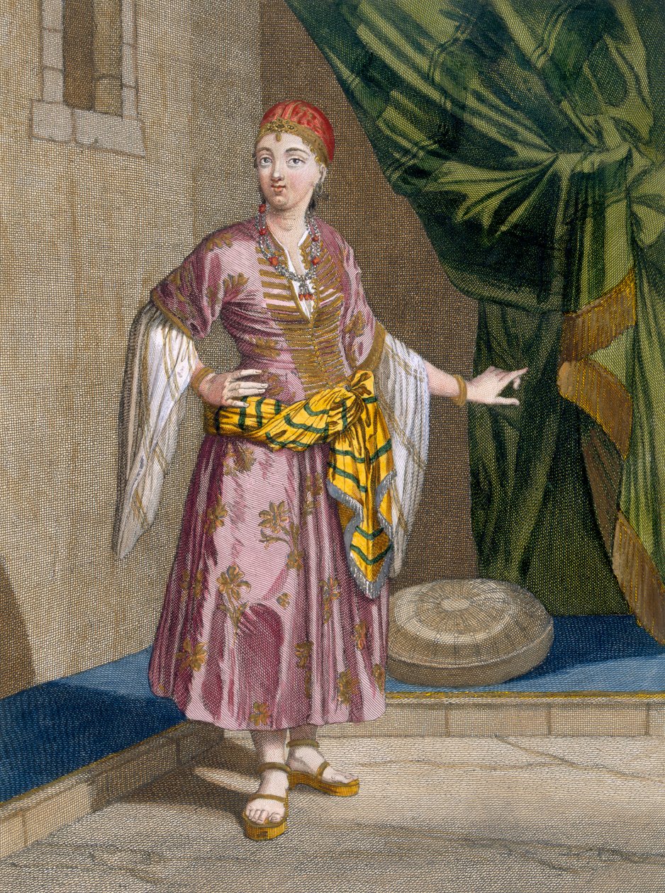 illustration · turkish · istanbul · costume · fashion · dress · eastern · full length · orientalism · exotic · oriental · female · north african · gown · white · pink · muslim · islamic · national · traditional · floral · embroidered · green · drapery · sash · bonnet · Private Collection / Bridgeman Images |