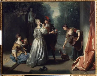 nature · female · women · woman · people · male · love · couple · fashion · garden · flower · flowers · plant · arts · painting · country · french · france · costume · clothes · color · colour · smelling · dress · location · century · lady · concept · lover · smell · fragrance · 18th century · eighteenth century · oil · jean raoux · raoux · jean · Fine Art Images/Heritage Images