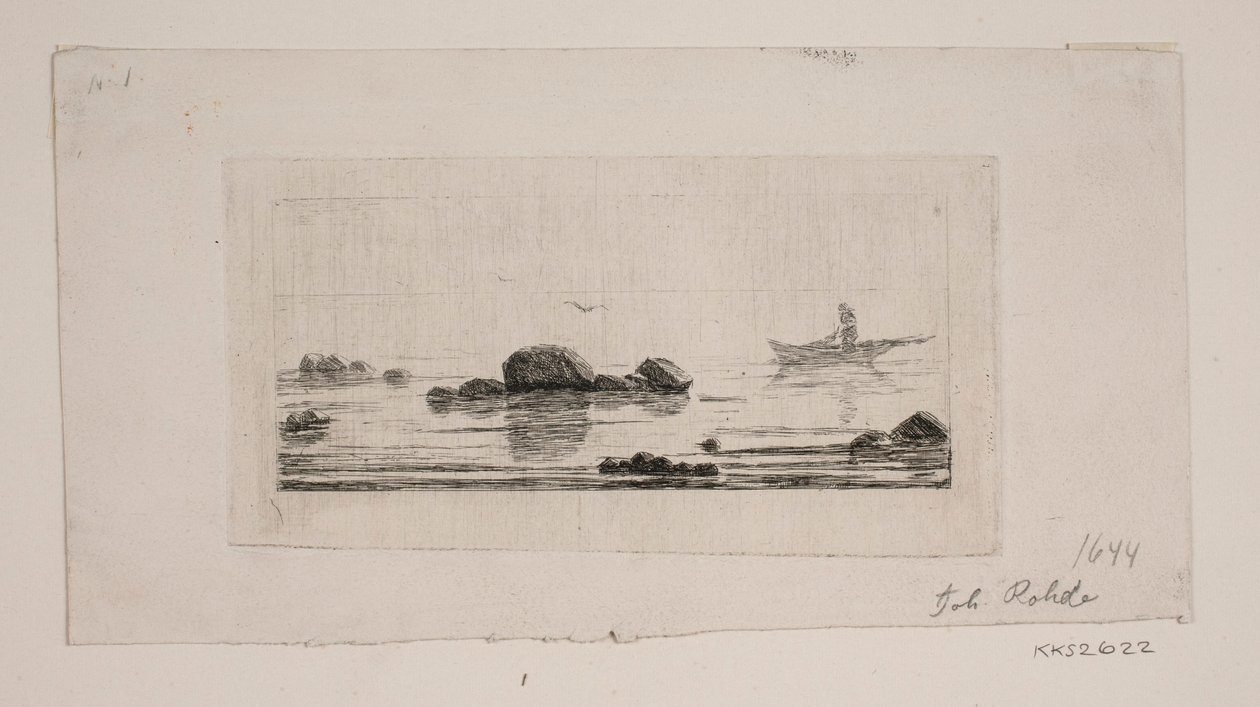 boat · person · water · rock · bird · reflection · white · black · gray |